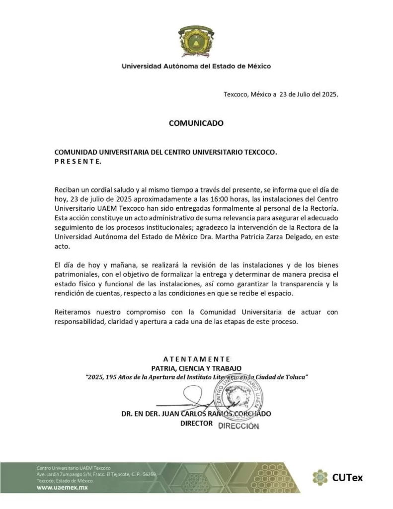 Tras el fructífero dialogo entre la nueva rectoría y los estudiantes que se encontraban en paro en la UAEM Texcoco, han acordado levantarlo y hacer entrega de las instalaciones a las autoridades, con el fin de que se reanuden las actividades y se de seguimiento a los puntos pendientes del pliego petitorio.