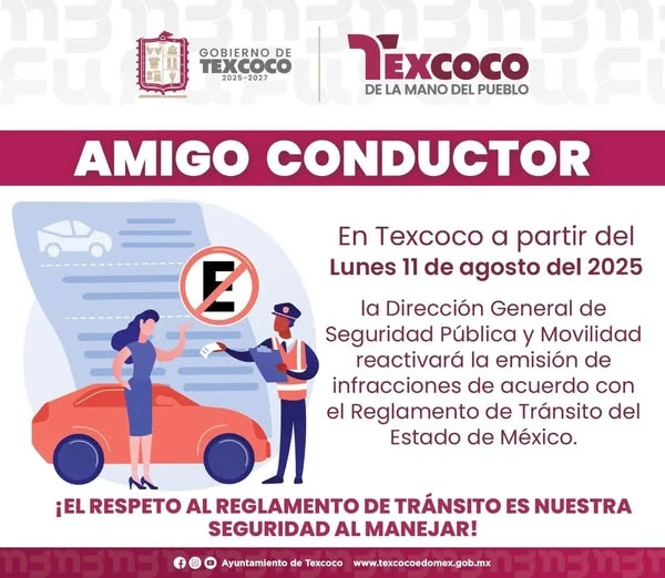 El H. Ayuntamiento de Texcoco informa a la población que las multas de tránsito serán reactivadas en Texcoco a partir el 11 de Agosto, mismas que seŕan aplicadas conforme al Reglamento Estatal.