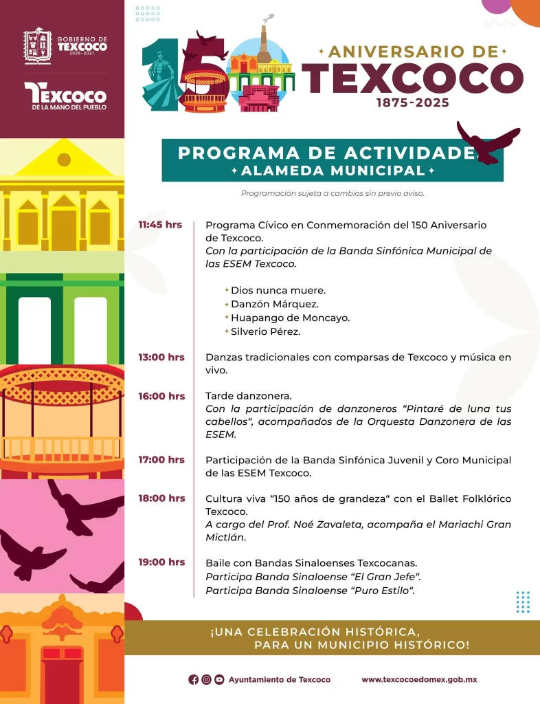 El Gobierno de Texcoco comparte el programa de actividades que se realiza con motivo del 150 aniversario del municipio.