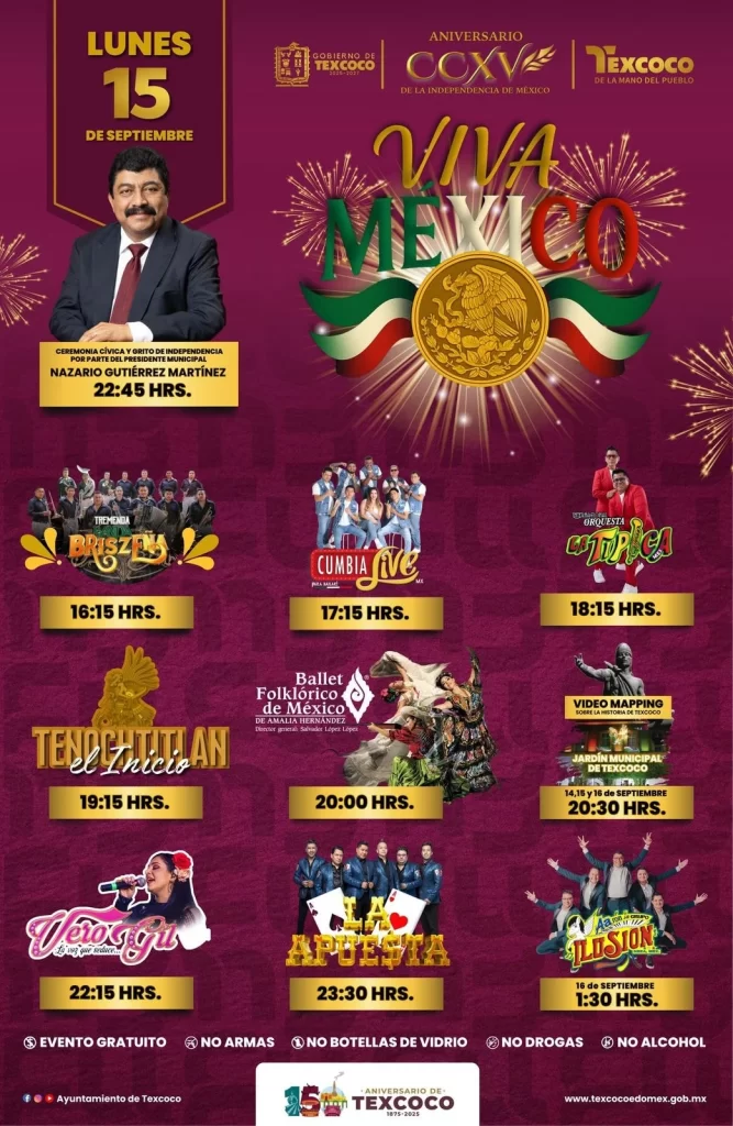 Programa del Grito de Independencia en Texcoco 2025Por admin / 14 septiembre, 2025 Saludos El Gobierno de Texcoco dio a conocer el cartel oficial de las actividades con motivo de las Fiestas Patrias, es el siguiente: Fuente: https://www.facebook.com/photo/?fbid=1130323925942212&set=a.300733938901219 Share this… Facebook Twitter Whatsapp Telegram Email Articulos Relacionados: Publican programa de fiestas patrias en Texcoco 2016 Programa de Fiestas Patrias – Grito de Independencia Texcoco 2019 Programa fiestas patrias Texcoco 2020, recuerda que será virtual Texcoco conmemora el CLXXXVIII Aniversario de la Erección del Estado de México.