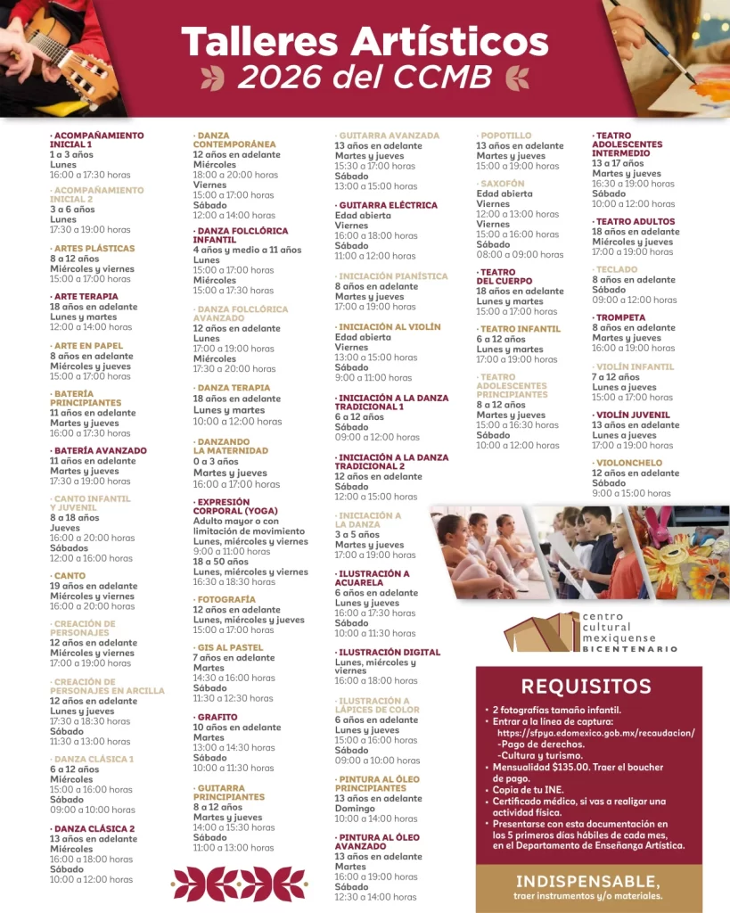 El Centro Cultural Mexiquense del Bicentenario dio a conocer su oferta de talleres, indicando que las fechas de registro son del 7 al 14 de enero, el costo no es especificado, indican que se pregunta directamente con el instructor.